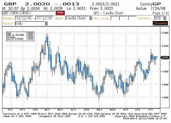 昨日英国的经济数据为英镑汇价带来抛压。centermovePlc的数据指出,英国7月份独栋房屋的平均卖价年降2%,月降1.8%,创去年12月以来最大减幅。另外,英国决策官员DavidBlanchflower接受卫报专访时强调,英国经济正逐渐走入衰退,可能会持续1年以上,央行必须把利率调降至目前的5%水平以下作为回应。受此影响,欧元/英镑一度涨至0.7974,亚洲时段英镑/美元也承压下跌,但北美时段美元的疲软使英镑收复失地。