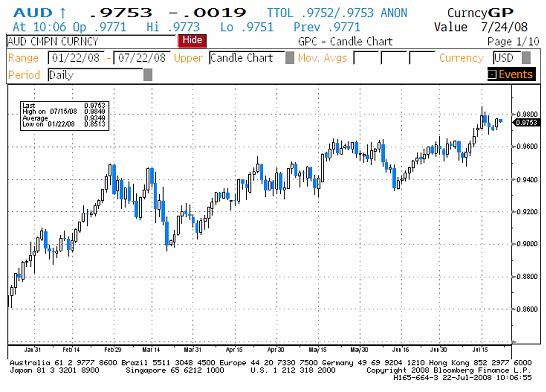昨日纽约商业期货交易所原油期货价格收高,结束此前连续四天的跌势,因预计热带风暴Dolly将到达德州重要的炼厂地区,同时伊朗在其核计划方面与西方大国僵持不下也推升油价。NYMEX-8月原油期货结算价收高2.16美元,或1.68%,至每桶131.04美元。另外由于美元汇价欲升乏力,为黄金价格也带来支撑。黄金现货周一攀升11美元至每盎司965.30美元。受此推动,澳元/美元在连跌三日后首次反弹。