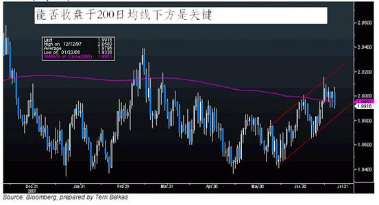 英镑/美元继续保持在上升通道内,但如今日收盘于200日均线1.9953下方,将可能大幅下行跌向1.9850,即将公布的英央行货币政策会议记录预期显示以8∶1票选保持利率在5.0%不变,若出现更多减息呼声,英镑/美元将大跌,若出现加息呼声,或者仅仅记录强硬,可能推动英镑/美元涨向2.0。