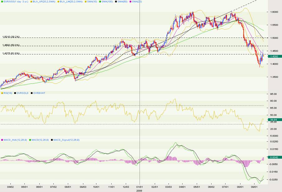 欧元/美元最近盘整跌幅,已经反弹到去年8月中旬低点1.3361至今年7月中旬高点1.6041的61.8%斐波回档位1.4375附近,若有效上破,将指向50%斐波回档位1.4690附近。最近美国金融动荡引发美元大幅下跌,从而给了非美货币喘吸的机会。若今日德国PPI较预期回落幅度大,则中期内将可能打压欧元,从而推动汇价继续在低位盘整。