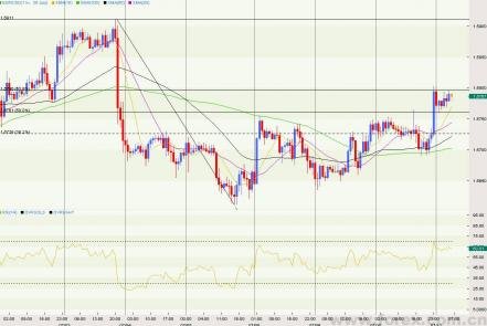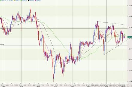美元/日元纽约开盘于107.30,美国上周初请失业金人数大幅减少5.8万,美元受到支持,汇价升至107.43,同时美国股指期货上涨也提供支持。Poole表示美国抵押贷款机构Freddie和Fannie可能破产,另外美国财长鲍尔森表示应允许金融公司破产,之后市场风险厌恶情绪打压股市,汇价跌至106.79低点。鲍尔森表示支持强势美元政策后,股市反弹,汇价也因此在107.04附近盘整。日图仍倾向盘整。小时图指标同样处于中位持平,汇价窄幅运行,表明近期内汇价倾向区间运行。支持、阻力如图: