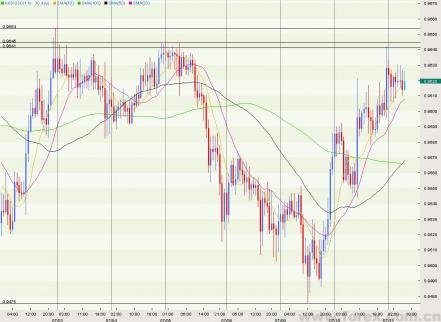 澳元/美元纽约开盘于0.9500,美国一连串的负面消息打压美国股市,美元全盘走低,汇价上涨至0.9639,期间引发0.9630处止损。午盘在0.9610-20运行,尽管油价、金价和商品价格指数CRB意外上涨。日图处于上行通道中,均线呈多头排列,指标看涨,表明中期内汇价倾向上行。小时图已经自超买水平向下反转,表明短期内汇价有下行盘整可能。