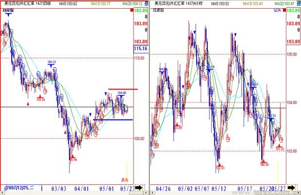 上周美元兑日元于105附近受阻震荡走低.上周二如预期日央行继续保持利率在0.5%不变,新行长白川方明重申日本经济仍面临下行风险,即使出口依旧坚挺,但日本企业盈利和资本支出增长缓慢,指出全球经济仍具不确定性.同时市场风险情绪仍左右日元的走势.近期国际油价不断传出新高,令美国经济承受越来越大的压力,美元受此影响出现大幅下跌.另外,美国上周公布的待售房屋数据不及预期,显示美国经济受次贷危机的影响,最坏的时期仍未过去.本周美国将公布消费者信心指数等重要数据,预计仍将显示其经济的疲软,对日元相对有利.技术图表所见,近期美元兑日元反弹受阻后呈震荡走低,在淘金指趋势图中,最新出现一个向下手指信号,相对应地过滤图则出现向上手指信号,反映目前走势不太明朗,整体以区间震荡走势为主,关注102整数位支撑及107整数位阻力.