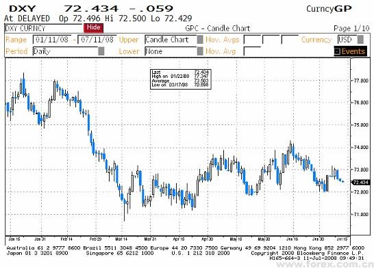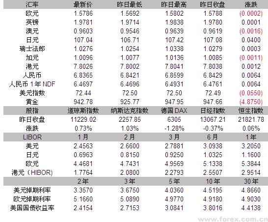 汇市上,美元/欧元下滑,受对美国金融业体质的持续忧虑拖累,欧元/美元报1.5780,升0.2%;美元/日圆升0.3%,报107.07日圆;英镑兑美元尾盘报1.9765美元,日内下跌0.3%。另外,债市上,美国国债价格下滑,股市反弹削弱了国债的避险魅力。