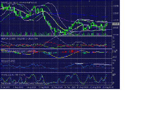 日线图中,美元/日元明显受阻于MA60一线,110。40/50附近。笔者认为汇价上破MA60一线的动力不甚明显。其一:从成交量来看,目前市场交易气氛属于小幅递减状态。其二:ADX的多空力量线处于纠葛状态,并没有形成明显的力量对比并分化。KD随机指标线目前形成交叉并迈向超买(80)区域的动力不足,交叉点大约在55的位置。因此笔者预计美元/日元进一步冲高的机会不大。汇价会在110。50受到卖方打压。