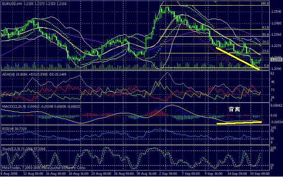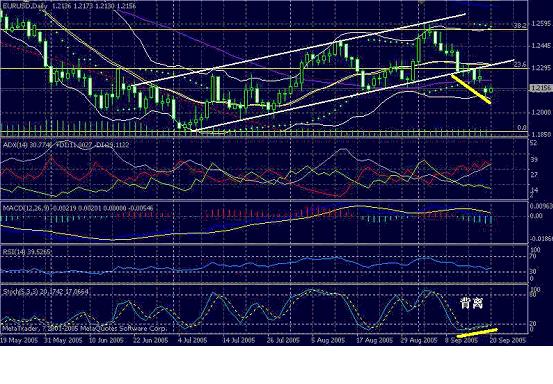 从中长期角度上看,欧元日线图中所显示的目前走势明显出现背离状态(KD随机指标),欧元回补周一跳空缺口有一定的技术需要。然而,笔者认为欧元中长期下跌的走势并没有彻底改变,ADX趋向指标显示空方力量线(红色)目前依然压过多方力量线(黄色),而且助长力量线也没有翘尾的迹象出现,笔者判定欧元在技术方面有中期回调的需要,但不足构成中长期继续下跌的威胁。目标阻力1。2200/10