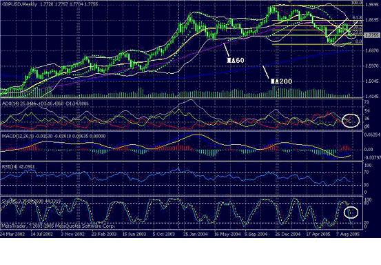 从长期角度看,英镑周线图中显示,目前英镑/美元成功下破费波那奇23。6%回撤水平正在得到最后确认,此前,英镑汇价已成功告破上升通道的下轨部分。笔者预期英镑汇价这周会继续下行,ADX趋向指标中显示,目前空方力量线(红色)明显压过多方力量线(黄色),这种趋势随时有扩大化的可能性,空方力量线压过多方力量线预示着市场走势会偏向空头市场,英镑会继续下跌。KD随机指标显示指标线目前正在朝空头方向进行,但是笔者提醒投资者,KD快线(指标线实线部分)也有随时向上调整的可能性,会给英镑大势下跌造成一定的延缓。