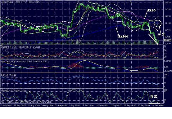 从中长期角度看,日线图中的英镑走势此前突破上升通道下轨,并沿着下降趋势线进行,目前有触轨反弹的迹象,但笔者认为从中期时段来看,这不足以改变英镑继续走软的预期,因为英镑汇价已经成功告破MA60一线的支撑水平,1。7870。ADX趋向指标显示,空方力量线(红色)明显压过多方力量线(黄色),而且有扩大的可能性,空方力量线压过多方力量线预示着市场偏向于空头。但在这里,笔者提醒广大投资者注意的是,目前KD随机指标已经严重超卖,预期英镑汇价在继续承跌期间,汇价的确有市场小幅回调的风险。