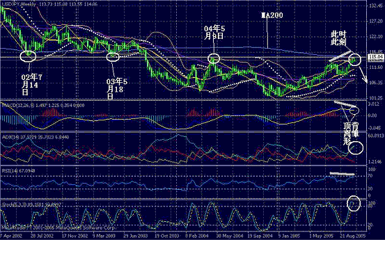 日元周线图中,上周美元/日元受阻在115重要支撑位附近,从图中我们可以看出,115这个阻力位值的重要性。这个位置曾分别是02年7月14日,03年5月18日以及04年5月9日的高点及低点价位,目前这条水平线已经成功与MA200重合,美元/日元冲破这个重要阻力可谓困难重重,因为技术指标显示其上行动力在逐渐削弱。KD随机指标,其指标线已经处在80以上的超买区域,接近90,并已经开始出现掉头回转的迹象,快线开始形成下穿慢线的预期(死叉的形成)。RSI与MACD目前渐渐形成顶背离趋势(顶背离预示汇价上行动力得到抑制),笔者认为,MACD的顶背离迟早要出现,但从目前来看,MACD的快线(蓝色)还未出现钝化,并掉头朝下与慢线(黄色)汇合,另外,ADX趋向指标,多方力量线(黄色)压过空方力量线(红色),助长线也没没有出现钝化并掉头回转之意,这都为美元/日元回调起到了一定的延迟作用。这也正是笔者预期汇价短期回落并集中波动于在113.50-115区间内的论断依据。但笔者仍然相信MACD的成功顶背离与ADX趋向指标中,多方力量的削弱(助长线,多方线的钝化)必将受到日元日线图中走势的策动。