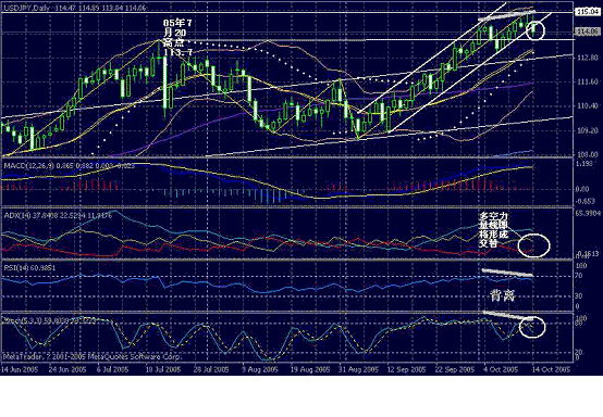 日元日线图中,美元/日元一直运行于的上升通道即将面临被突破的风险。汇价面临的下一个支撑位于113.70附近,也就是05年7月20日高点。技术指标上也给汇价突破下轨的预期提供依据。目前RSI与KD随机指标显现出顶背离的预期(顶背离预示汇价上行动力得到抑制),KD指标末端也已经开始从80超买区域掉头回落。在ADX趋向指标中,多空双方的力量线有交替的预期,这里表现的是,空方力量线(红色)有替换掉多方力量线(黄色)并主宰市场力量的预期,但成功与否还需进一步观察,这里只是预期在形成。从MACD指标力量来看,目前零轴上方的快线与慢线已经成功汇合,并走出平缓的顶部,这说明美元/日元汇价上行动力趋于节制。总体来说,美元/日元能否有效告破下轨支撑需要下周一系列重大财经事件结果以及市场反应的进一步确认,然而从技术走势来看,美元/日元回调的基本雏形已然形成。
