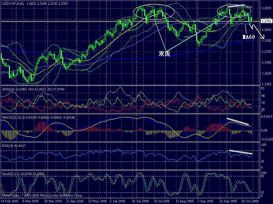 在瑞郎日线图中,美元/瑞郎从形态来看已经逐渐形成M顶,双顶在图中笔者有所标示,M顶的右顶已经形成,因此,美元/瑞郎形态下一步的走势预期应为突破颈线继续下行,在这里,我们不妨看一看M顶右顶的形态,图中,小的M顶再一次嵌套在右顶之中,同时,未端下行趋势正在履行突破其颈线的技术预期之中。在MACD指标中,指标线目前与此前汇价走势呈现出相反的趋势,即顶背离的出现,顶背离预示着美元/瑞郎上行动力开始逐渐削弱,汇价下行的动能开始逐渐局级。笔者预期美元/瑞郎汇价下行面临重要支撑考验位置在MA60一线,也就是大约在M顶颈线大致的位置,1。2700左右,如能顺利下破,美元/瑞郎下行中短期行情便会得已确认。