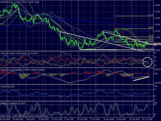 在欧元日线图中,上周汇价明显受阻于MA60一线从而失败回落。然而在技术指标当中,欧元/美元下行的动力并不强劲。从ADX趋向指标当中来看,目前多方力量线(黄色)、空方力量线(红色)以及助长线(灰色),三线处于纠葛状态,多空双方的力量对比目前没有形成强有力的分化,所以,汇价将维持盘整格局的预期较为合理。但是,欧元/美元的进一步上行预期同时存在,在MACD指标中,指标线出现的底背离趋势并没有完全被上周五美国第三季度GDP的超预期结果瓦解。因此欧元继续上行存在的可能性很大。短线面临的支撑位于费波那奇23。6%回撤水平(05年9月2日高点与10月19日低点间连线),价位在1。2040左右。