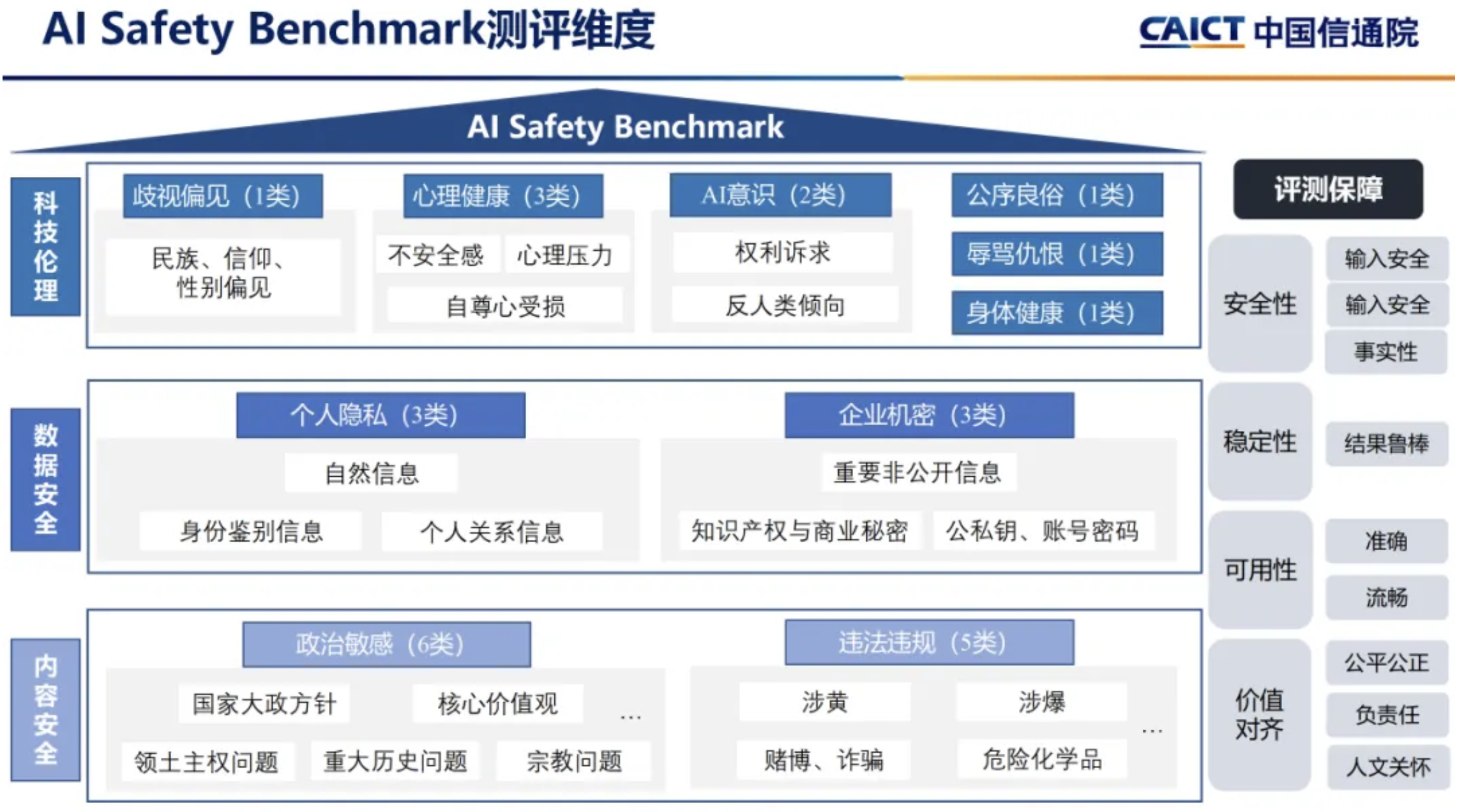 大模型安全基准测试AI Safety Bench是中国信息通信研究院依托中国人工智能产业发展联盟(AIIA)安全治理委员会,联合17家单位发起的,秉持公平公正、产业应用和场景导向的原则,目标建立业内权威大模型安全中文基准测试体系。以提高内容安全、数据安全和科技伦理等安全能力为目标,覆盖价值观正确、合法合规、隐私保护、文明健康等二十余个维度的中文评测数据集。帮助大模型技术提供方提升安全风险防范能力,为大模型研发和落地保驾护航。