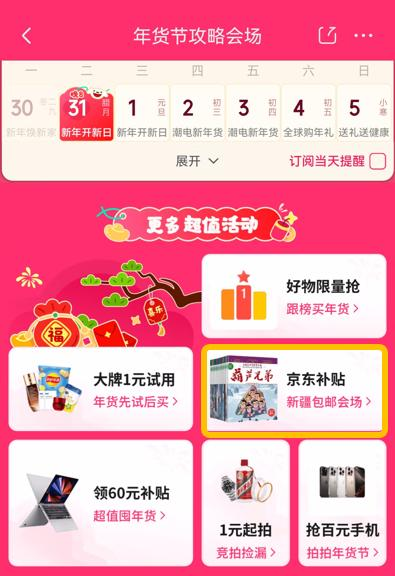 京东年货节已全面开启,海量爆款年货好物整装待发,为消费者带来“又好又便宜”的消费体验。今年年货节,京东官方补贴消费者邮费推出新疆包邮会场,让新疆的消费者在享受丰富年货的同时,也能体验到更加便捷和经济的购物体验。各地消费者均可通过“年货节攻略会场”下的“更多超值活动”,找到并进入新疆包邮会场,收件地址为新疆的订单即可享受包邮服务。