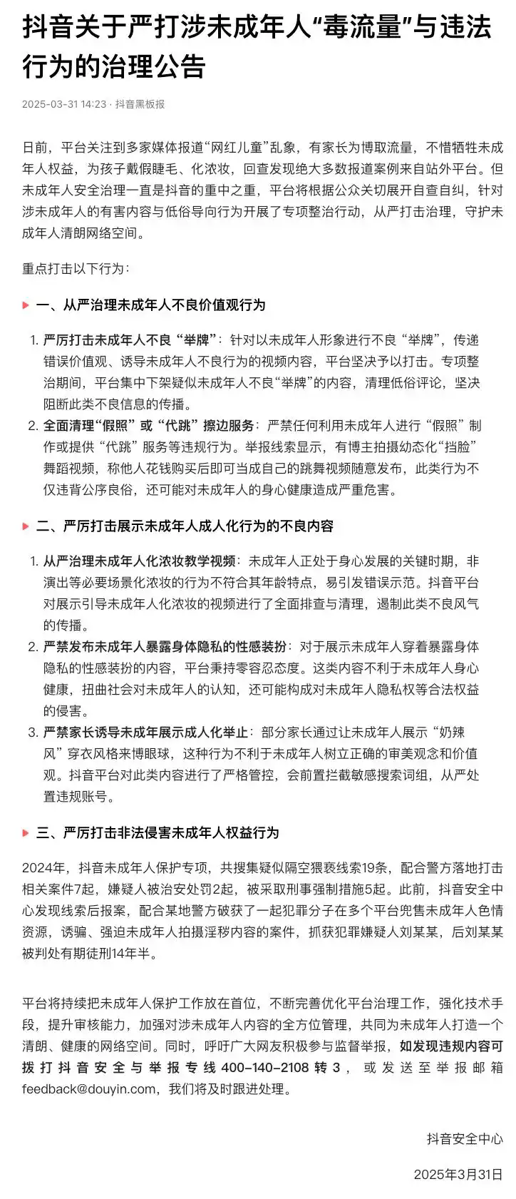 3月31日,抖音安全中心发布公告称,平台日前关注到多家媒体报道“网红儿童”乱象,有家长为博取流量,不惜牺牲未成年人权益,为孩子戴假睫毛、化浓妆,回查发现绝大多数报道案例来自站外平台。但未成年人安全治理一直是抖音的重中之重,平台将根据公众关切展开自查自纠,针对涉未成年人的有害内容与低俗导向行为开展了专项整治行动,从严打击治理,守护未成年人清朗网络空间。