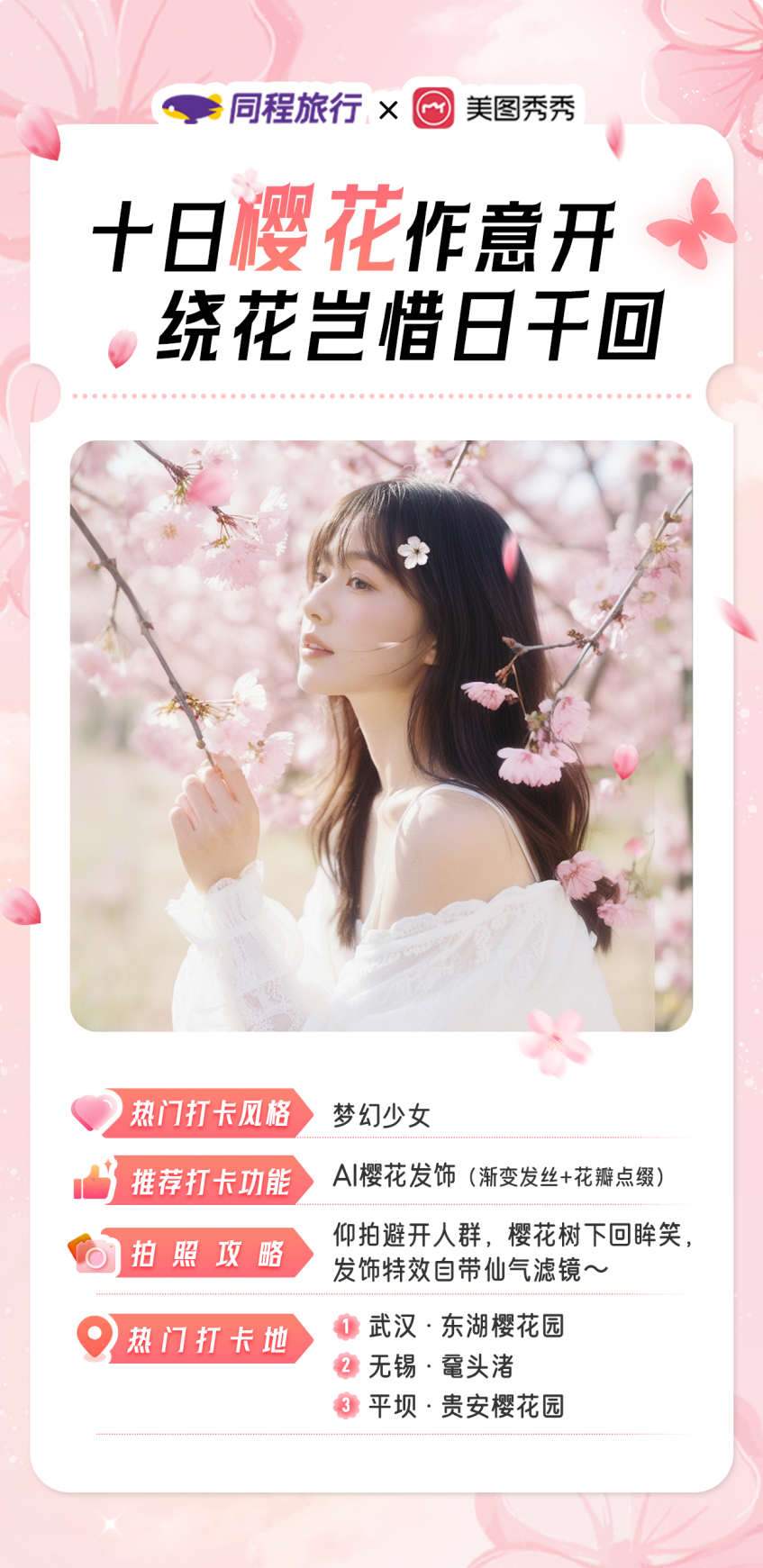 恰逢樱花季,美图秀秀为用户推荐“梦幻少女”风打卡。游客借助“AI樱花发饰”特效,将渐变粉紫发丝与飘落花瓣叠加,仰拍镜头下回眸浅笑,一键生成仙气十足的樱花写真。同程旅行数据显示,武汉东湖樱花园、无锡鼋头渚和贵安樱花园赏樱热度最高,其中,无锡鼋头渚3月门票预订热度环比上涨超3倍。