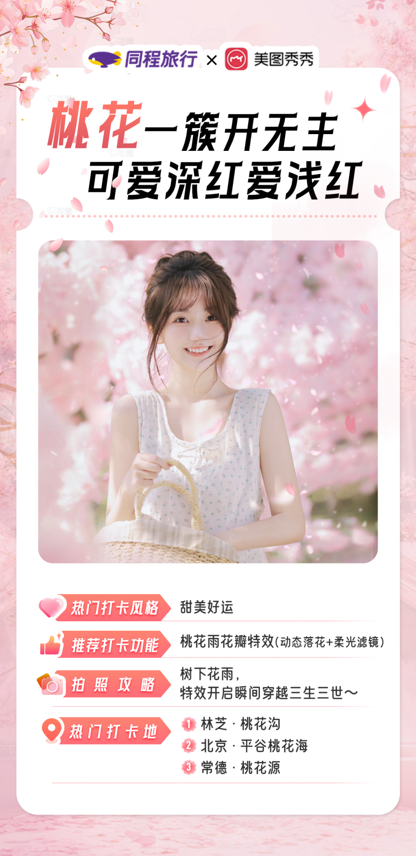 打卡桃花林,美图秀秀推荐粉色的桃花和“甜美好运风”照片最搭,开启“桃花雨花瓣特效”可以让照片瞬间开启穿越模式。同程旅行平台上,林芝桃花沟、北京平谷桃花海和常德桃花源是最热门的桃花打卡地。