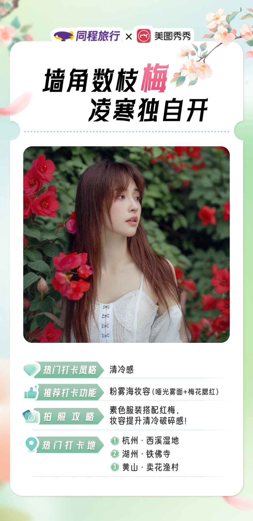 梅花的打卡风格聚焦清冷氛围,美图秀秀建议用户选择素色服饰,在梅枝疏影间利用花枝半遮面部的构图方式营造美感。拍摄时可使用“粉雾海妆容”特效,通过哑光雾面底妆与点涂式梅花腮红强化清冷气质。同程旅行平台上,杭州西溪湿地、湖州铁佛寺和黄山卖花渔村是最热门的梅花打卡地。
