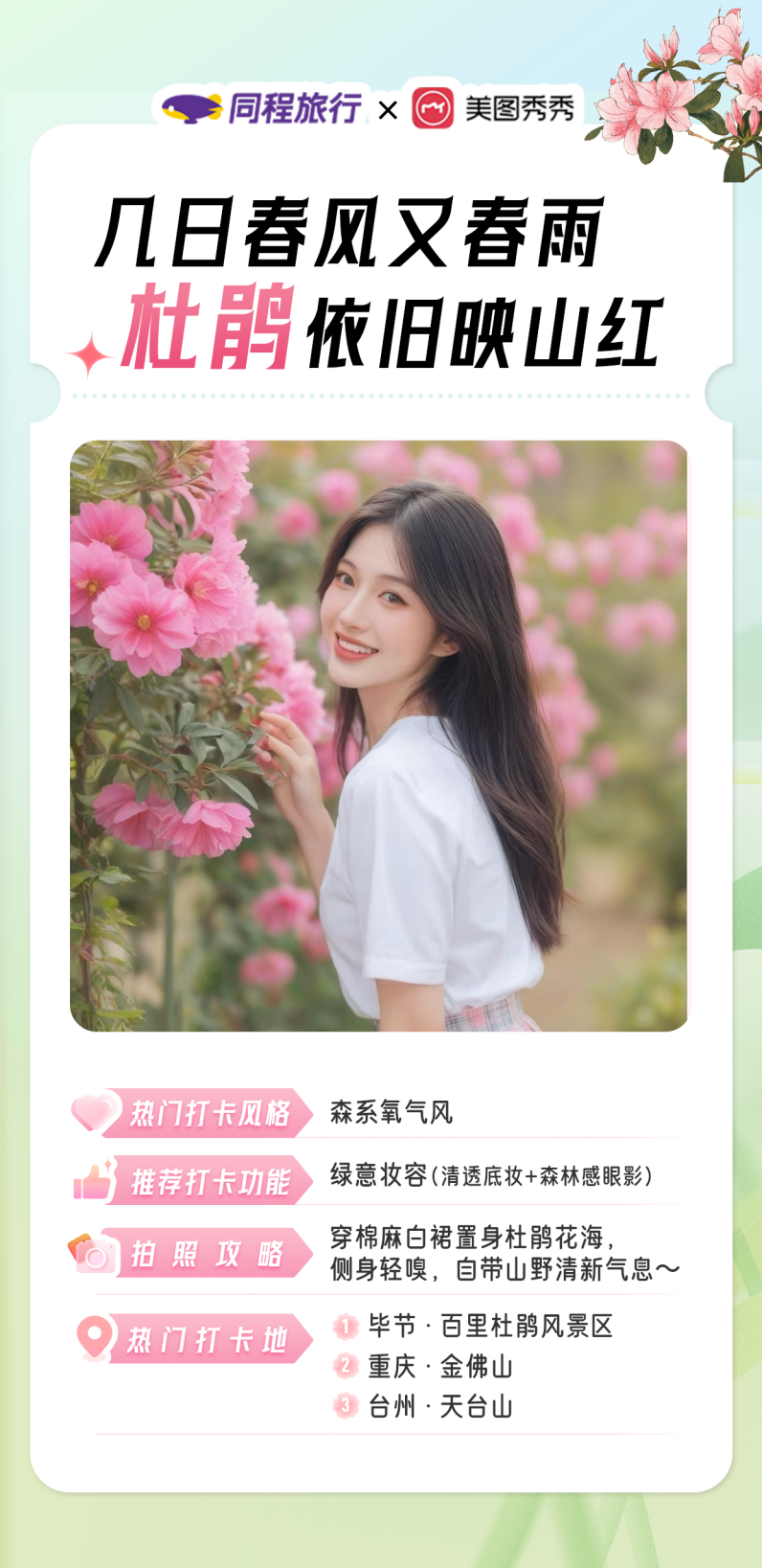 毕节的百里杜鹃风景区是同程旅行平台上热度排名第一的杜鹃花打卡地。今年杜鹃花季,百里杜鹃将推出祭花神、花仙子巡游、无人机光影秀等文化+科技体验的新玩法,还将举办百里杜鹃“村BA”系列赛,吸引游客前往。同程旅行数据显示,3月20日以来,毕节旅游热度环比上涨68%。重庆金佛山、台州天台山杜鹃花打卡热度排名第二、第三位。美图秀秀建议选择棉麻材质白色连衣裙,在杜鹃花丛中以侧身轻嗅姿态构建自然叙事感。
