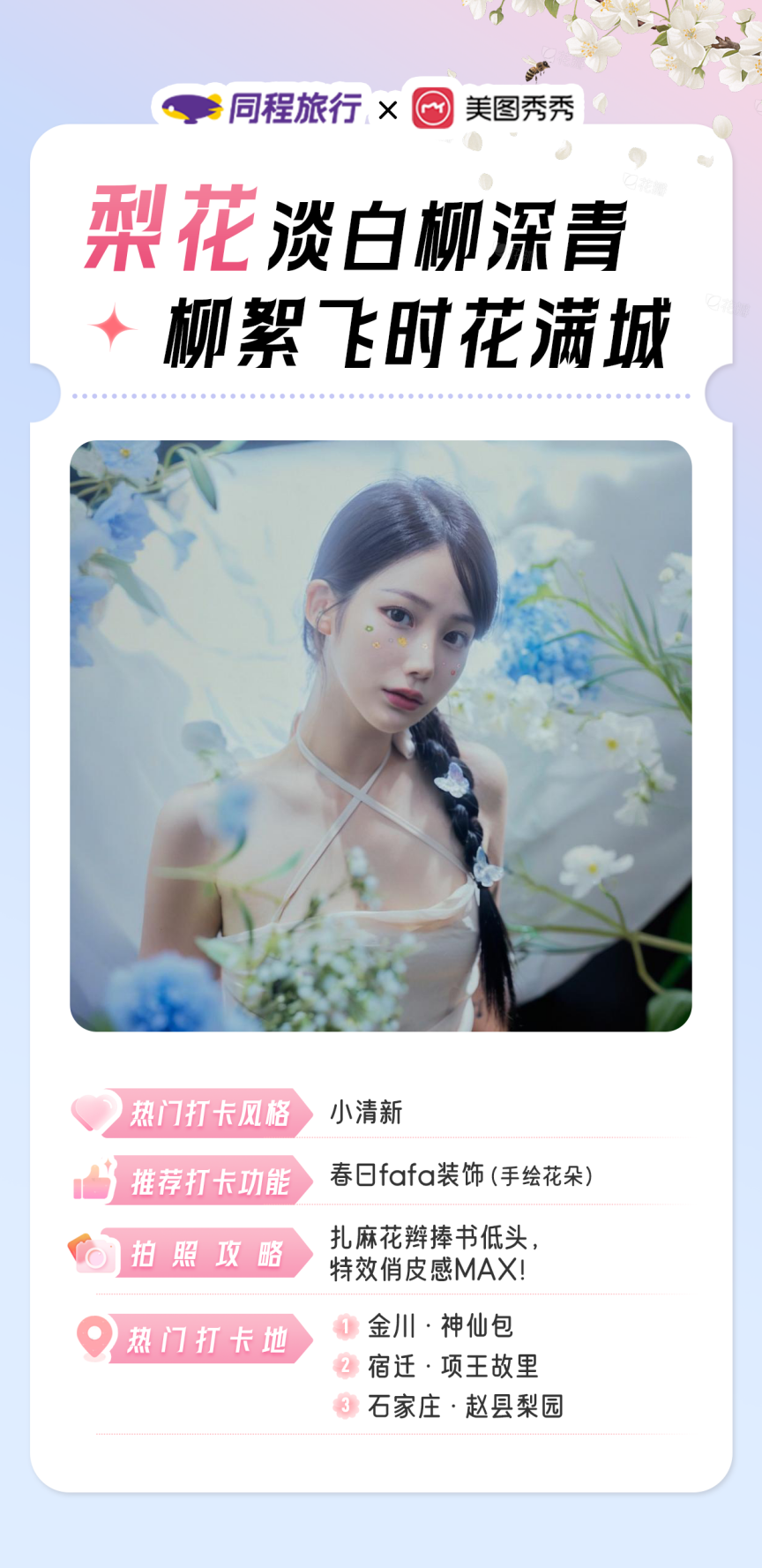 相比其他花卉的艳丽,梨花更适合小清新拍照风格。美图秀秀建议用户可以携带书本之类的文艺风道具打卡。春日手绘花朵的装饰也能为梨花打卡照增添氛围感。同程旅行平台上,金川的神仙包、宿迁项王故里和石家庄赵县梨园是赏梨花的热门打卡地。为方便自驾用户前往城市郊野赏花,同程租车推出了踏青专属活动,用户登录活动页面最高可领取1096元每日租车券,轻松开启全国自驾赏花之旅。