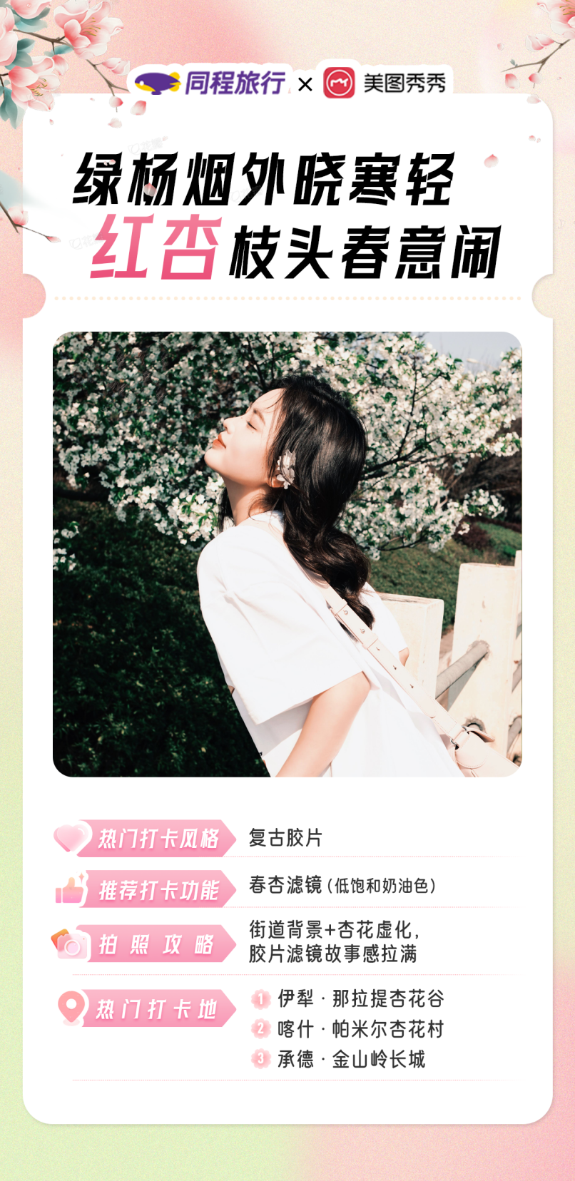 新疆的杏花主题游成为近年来国内热门的中长线赏花线路。伊犁那拉提杏花谷和喀什帕米尔杏花村大片的杏花和村落交织,吸引全国各地的游客前往。此外,承德金山岭长城烽火台旁杏花簇拥,是京津冀周边居民春季赏花出游的热门景区。美图秀秀用户喜爱的复古胶片风最适合杏花拍照打卡,分分钟复刻90年代文艺画报。