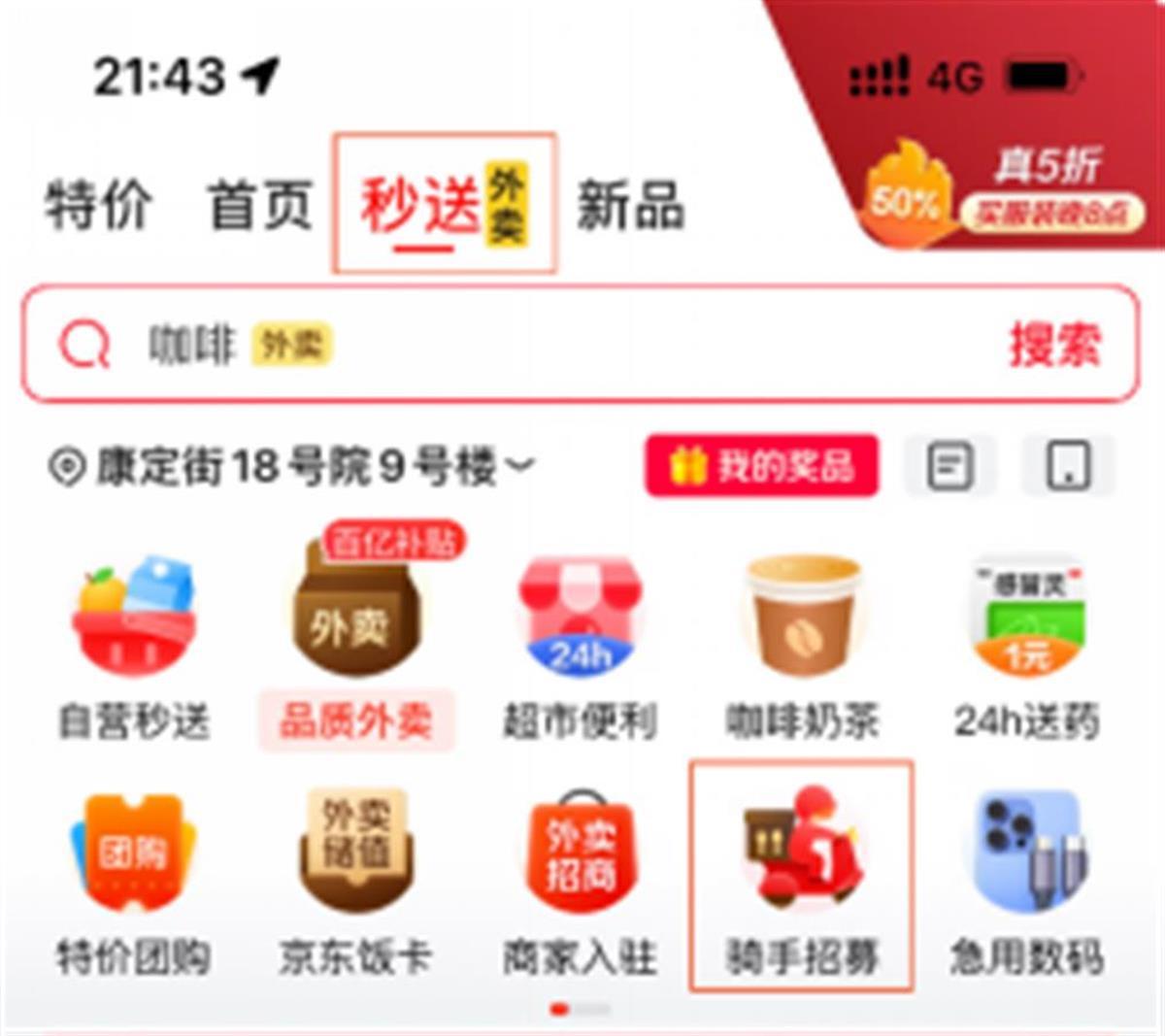 2、在京东APP首页,点击顶部“秒送”频道后找到【骑手招募】球进行报名。如找不到首页“秒送”频道,可以升级京东APP至最新版本。