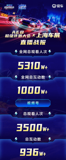 此次易车AEB超级评测大会吸引了大量的关注和讨论,全网总播放量超5310万,互动量超过1000万。不仅为消费者提供了有价值的购车参考,让消费者在购车时能够更加全面地了解各车型的主动安全性能,同时也为不断优化AEB系统的性能,提高汽车的主动安全水平,推动整个汽车行业技术发展提供了有益参考 。