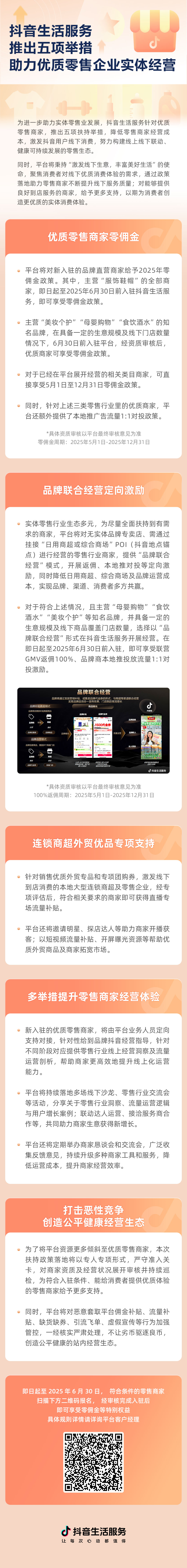 对于符合上述情况,且主营“母婴购物”“食饮酒水”“美妆个护”等知名品牌,并具备一定的生意规模及线下商品覆盖门店数量,选择以“品牌联合经营”形式在抖音生活服务开展经营。在即日起至2025年6月30日前入驻,即可享受联营GMV返佣100%、品牌商本地推投放流量1:1对投激励。