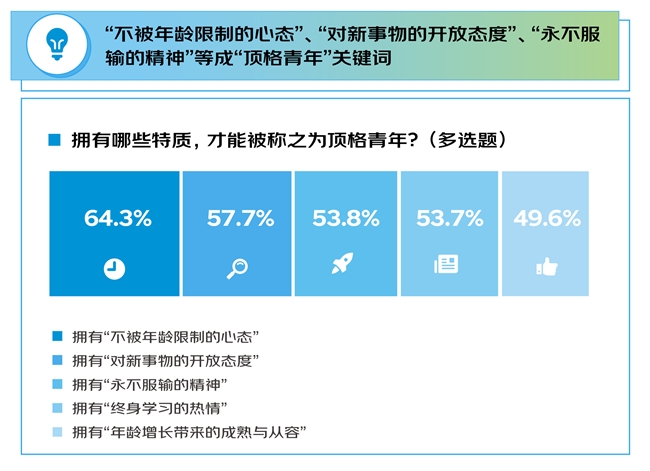 随着年龄的增长和阅历的增加,在职场上,他们可能已经成为独当一面的业务骨干;在生活中,他们可能是支撑家庭的坚实力量。但在他们当中,依然大量的人坚定地认为自己是青年,调研显示,73%的受访者愿意被称为“顶格青年”,而在“顶格青年”的特质上,64.3%的人认为要拥有“不被年龄限制的心态”,这是提及率最高的特质,“对新事物的开放态度”“永不服输的精神”“终身学习的热情”和“年龄增长带来的成熟与从容”等特质的提及率也较高。