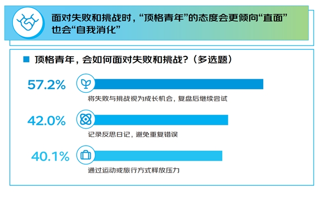 在面对失败和挑战时,“顶格青年”的态度会更倾向“直面”也会“自我消化”。57.2%的受访者将失败和挑战“视为成长机会,复盘后继续尝试”,42%的受访者会“记录反思日记,避免重复错误”,40.1%的受访者会“通过运动或旅行方式释放压力”。