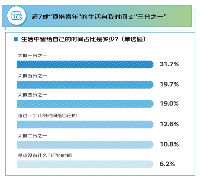 在工作与家庭生活的羁绊下,“顶格青年”在时间分配的夹缝中不断寻求自我空间。调研显示,工作和孩子是占据生活精力的两大核心,31.7%的受访者坦言,投入在“自我”上的时间为全天总时间的大约1/3,而选择1/4-1/5的比例也较高,当然也有部分人群的自我时间能够超过1/2。但不管如何,在对话中能清晰地感受到,随着阅历的增长,许多“顶格青年”在工作、家庭与自我之间逐渐找到了更从容的应对方式:一位80后二孩妈妈在谈及她的工作项目、育儿任务与自我投资三线并行状态时表示,“不管工作和孩子让我多忙,我都会给自己一个空间,去持续地学习、去运动,甚至去跳舞,我会以个人兴趣为出发点去盘‘自我时间’,因为在我是‘孩子妈妈’这个身份之前,我首先是‘我自己’。”