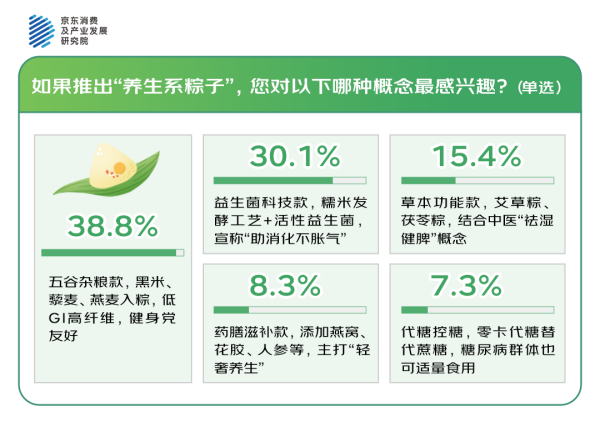 此外,“朋克养生风”吹到了粽子界,调研显示,在创新粽子中选择“功能养生款”的消费者比例最高,其中低GI高纤维的五谷杂粮款粽子和主打“助消化不胀气”的益生菌元素款粽子等更受消费者青睐。京东超市消费趋势显示,养生类粽子销量农历同比增长达177%,药食同源、燕窝、杂粮等健康食材成为养生粽的“三大顶流”。