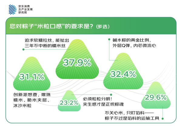 一位在调研中倾向选择自己包粽子的消费者认为,粽子米的选择非常重要,选对了米包出来的粽子才能软糯适口不粘牙。七分糯米三分粳米是粽子的黄金比例,圆润饱满的糯米搭配当季新粳米。在对米粒口感的追求上,调研显示,37.9%的消费者依然钟情于“软糯拉丝”的经典口感,但同时也有32.4%的人偏爱碱水粽那种外层Q弹,内芯流心的独特口感,还有31.1%的人属于口感创新派,想要尝试“爆珠糯米+脆米夹层+冰沙米粒”的多重口感。23.2%的受访者比较特立独行,认为颗粒分明的夹生感才是“正统粽魂”。