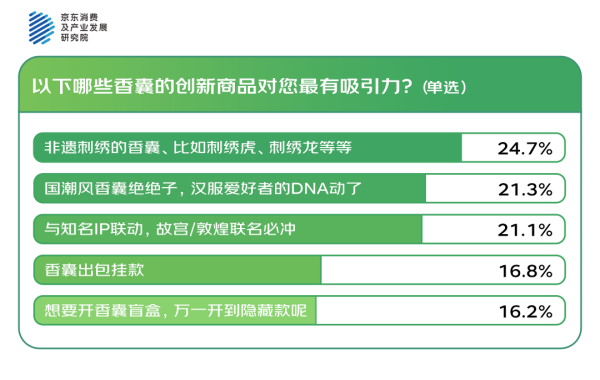 端午元素破圈,在文创产品创新的加持下,以更加多样化的形式呈现,走入消费者的日常生活。端午元素包挂件成为行走的文化符号彰显独特个性,22.0%的消费者热衷“龙舟造型包挂件”,21.7%的消费者明确表示喜欢“可爱或搞怪的粽子包挂件”。同时有超三成消费者认为“香囊是古代版的香薰,当代的去班味神器”,有超四成的消费者会选择香囊摆件作为礼品,认为“送香囊摆件很实用,能避邪能当去班味”,而在香囊的创新产品上,消费者认为“非遗刺绣的香囊”“国潮风香囊”更具有吸引力,日常还可搭配汉服穿搭出街。