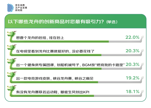 在传统文化复兴热潮下,龙舟作为端午热门IP之一,成为深受年轻人喜爱的文创新icon,开发出多种“周边衍生品”。在带有龙舟元素的创新产品中,选择龙舟包挂件的比例最高,有受访者调侃表示,戴个龙舟造型的包挂件,“仿佛上班划水摸鱼都更有底气了”。还有受访消费者希望买到龙舟联名运动鞋,认为是“传统文化与现代运动潮流的完美结合”。更有消费者希望游戏厂商推出“龙舟皮肤”,在线上来一场“赛博龙舟赛”。
