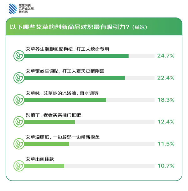 从驱邪到养生,从仪式到日常,丰富多样的艾草产品在今年的端午消费季掀起了“新草本经济”热潮。调研显示,在艾草的创新应用中,24.7%的受访消费者被“艾草养生泡脚包配枸杞”所吸引,选择“艾草驱蚊空调贴”的占21.3%,同时“艾草味的沐浴液、香水调”等也收获了18.3%消费者的青睐。