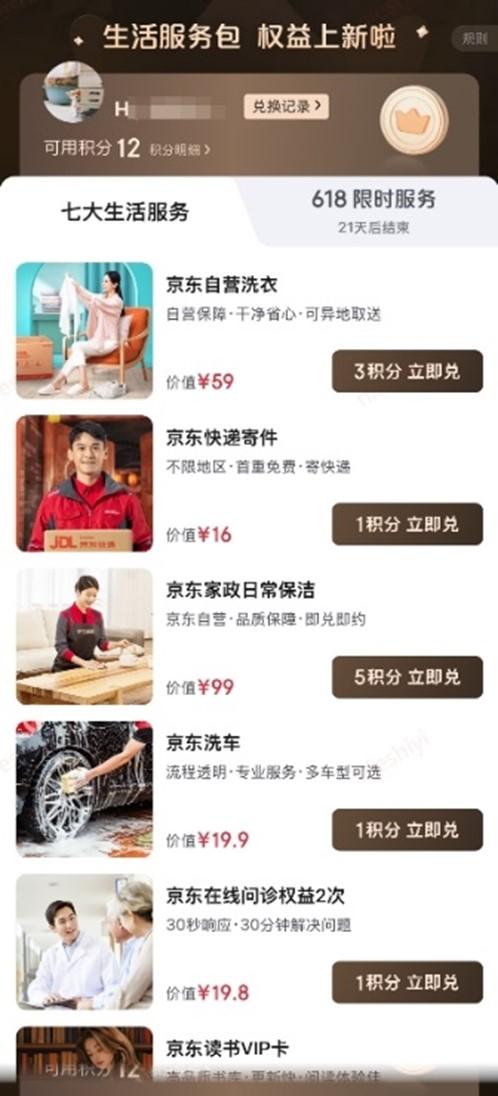 今年年初,京东PLUS会员全面升级,新增“生活服务包”,每个PLUS用户年卡效期内享有12个基础积分,用积分可免费兑换“生活服务包”里的家政、洗衣洗鞋、洗车、问诊等即时服务,享受更多便利和实惠。今年京东“618”大促期间,京东对于新开卡的用户推出积分翻倍福利,额外再送12积分,相当于新会员直接获得24积分,可兑换价值超过480元的服务,额外赠送的积分兑换有效期截止日期为6月20日。