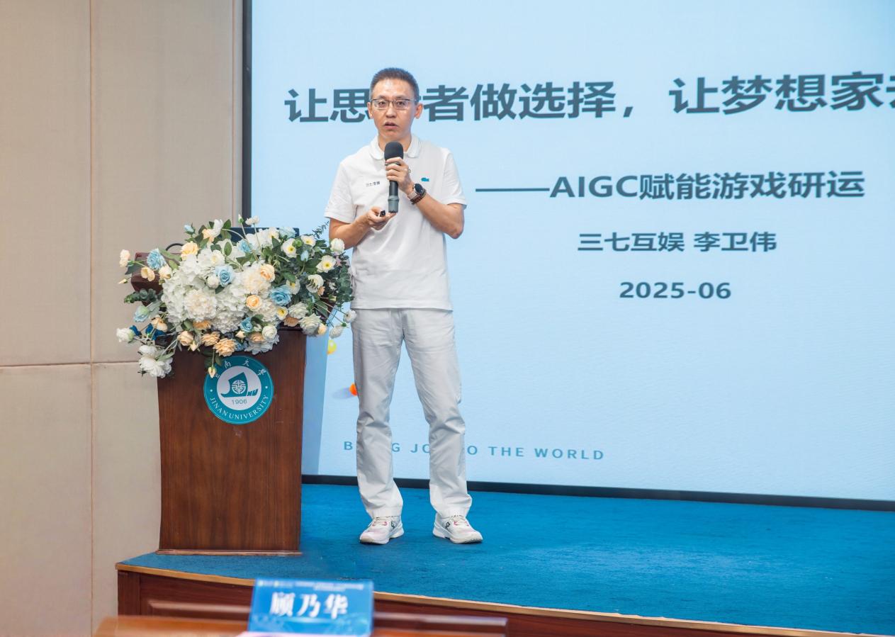 现场,李卫伟还首次以客座教授身份进行学术分享,以《让思考者做选择,让梦想家去创造——AIGC赋能游戏研运》为题,为暨南大学的师生们带来了一场精彩的行业前沿讲座,重点介绍了三七互娱在人工智能领域的战略布局和使用情况,以及建议“新生代”人才应该如何把握AI时代的机遇。