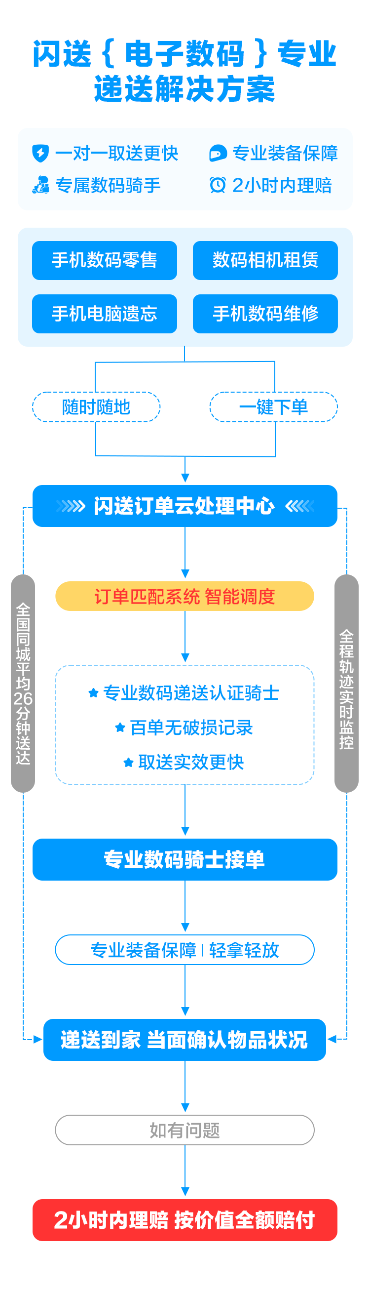 针对上述多元场景中的核心需求:时效、安全、专业、保障,闪送推出了"手机数码专业递送解决方案",该方案具有“一对一”取送更快、专业装备保障、专属数码骑手接单、2小时内快速理赔保障四大特点,致力于以更加安全、高效、省心的递送服务,确保用户在多元消费场景下的需求得到满足。