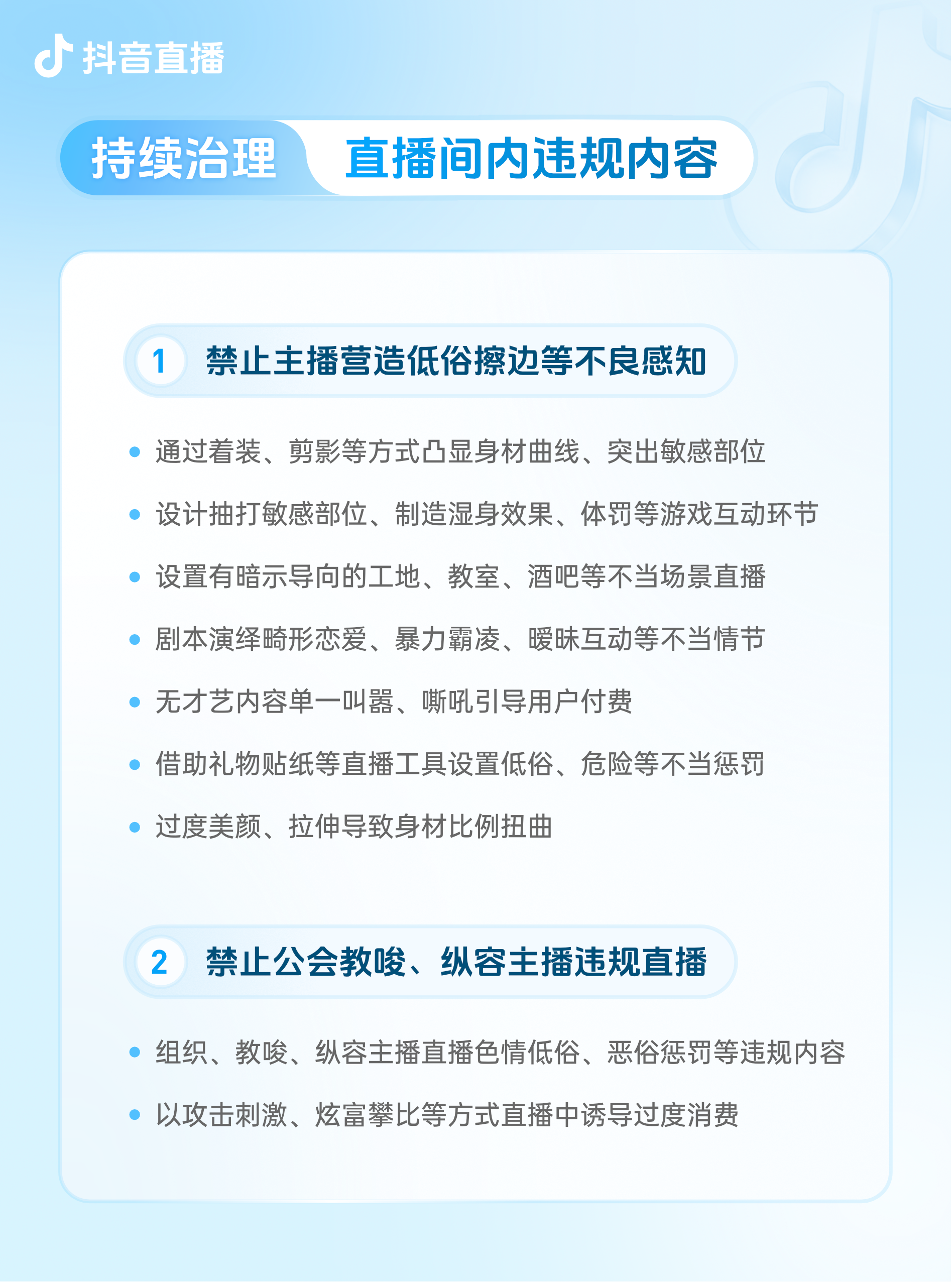 抖音直播始终严格治理低俗擦边、恶俗惩罚等违规内容。
