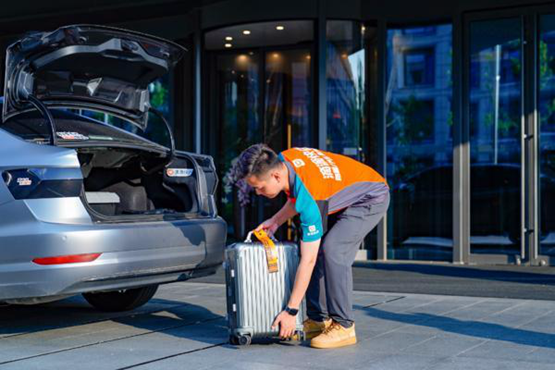 (快送员在为离店游客配送行李)