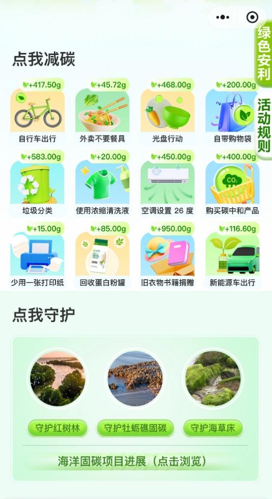 “碳账本”小程序可清晰记录新能源车出行、光盘行动、自带购物袋、垃圾分类、使用浓缩清洗液、购买碳中和产品等12项低碳生活行为,让个人减碳量一目了然。21天内累计满80KG减碳量的用户,将获得“个人碳中和成就证书”,同时安利配捐200元,专项用于海洋固碳公益项目。