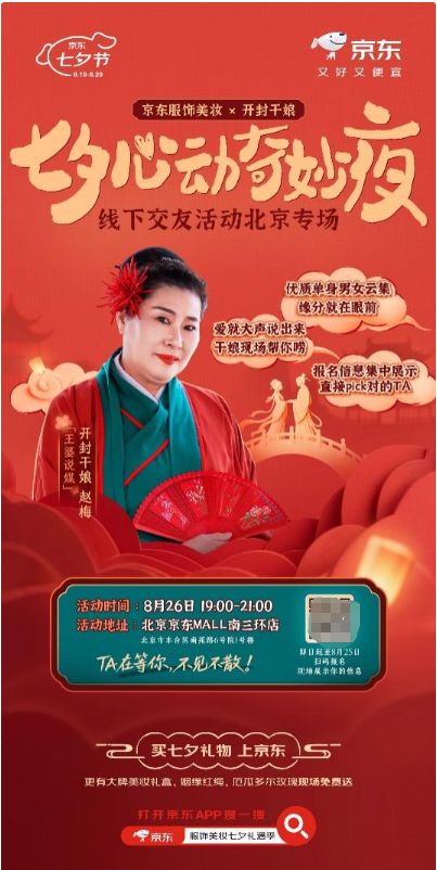 8月26日19:00,京东服饰美妆还联合京东MALL,将携手网络爆火的开封交友栏目《王婆说媒》主持人赵梅,在京东MALL北京南三环店打造“心动奇妙夜”线下交友专场,助力广大单身青年邂逅佳偶良缘。