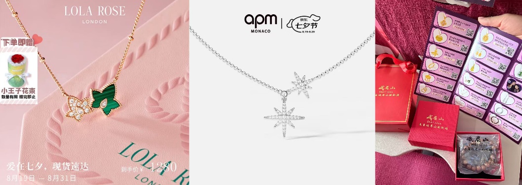 不止黄金,精致的珠宝配饰都为爱人的穿搭加分。LOLAROSE 罗拉玫瑰常青藤双叶项链,灵动的孔雀石纹理,定格幸运时分;APM Monaco 六芒星项链,拉长流星角设计丰富造型美感,很适合搭配聚会礼服。此外,8 月 19 日京东还携手海南航空打造七夕主题航班,不仅为机上乘客推荐大牌珠宝腕表等七夕礼物,还为每位乘客准备了峨眉山金丝檀手串伴手礼,手串由金丝檀木制成,圆润细腻,寓意平安吉祥。