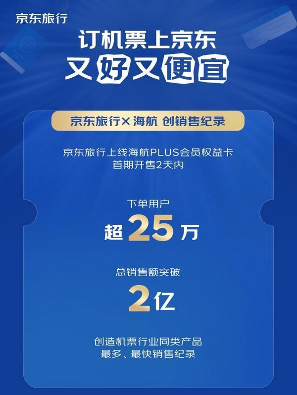 8月27日,京东旅行宣布“199元飞全国,不限次”的“海航PLUS会员权益卡”将于七夕当天在京东旅行返场开售。作为近年来“随心飞”产品中的爆款,据悉该产品曾在8月初上线京东旅行,因其性价比极高,上线仅15分钟就被抢购到断货,后又多次补货。根据京东旅行官方披露,该产品上线仅半小时销售额已实现破亿,2天内购买用户突破25万人,销售金额超2亿。目前,该产品已在京东旅行开放预约,在京东App搜索“海航666”即可预约抢购。