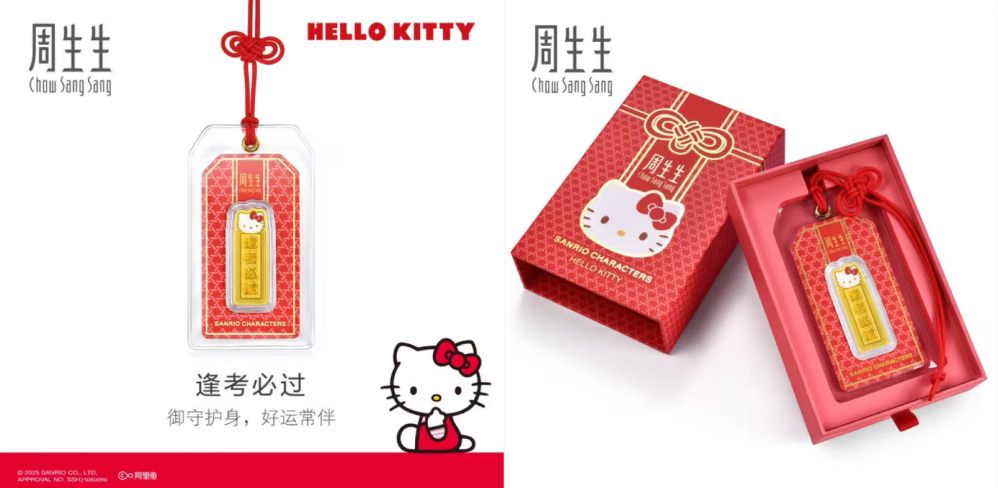 另一款全网首发的新品三丽鸥家族HelloKitty 足金御守金片,将风靡全球数十载、备受各年龄段喜爱的Hello Kitty经典形象,搭配“美梦成真”祝福语与御守造型,融入美好寓意,既是时尚配饰,也是传递祝福的精致礼物。