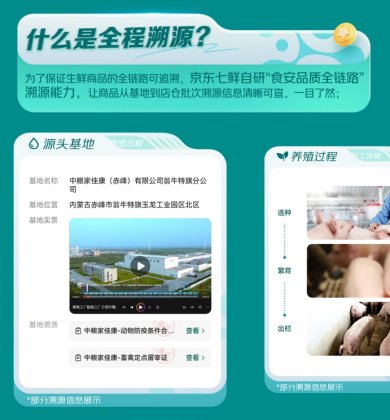 目前,京东七鲜App与小程序已上线数十款支持“全程溯源”的生鲜商品,涵盖肉类、海鲜、蔬菜、水果等多个品类。以180天白猪冰鲜猪肋排、深海野游大黄鱼、富硒菠菜苗、北京庞各庄头茬小西瓜等为例,在源头管控环节,可以追溯到种植/养殖基地具体位置、各类资质证明、出厂检测报告;物流运输环节,可以实现运输方式与运输环境温度监测记录;入库仓储部分,可以实现入库质检结果、检测报告的系统化留存;城市配送、门店销售等环节则实现了商品流、温度、进店检测报告等全环节记录及监控。六大流通环节信息完整串联,构成真正意义上的“端到端”安心保障。