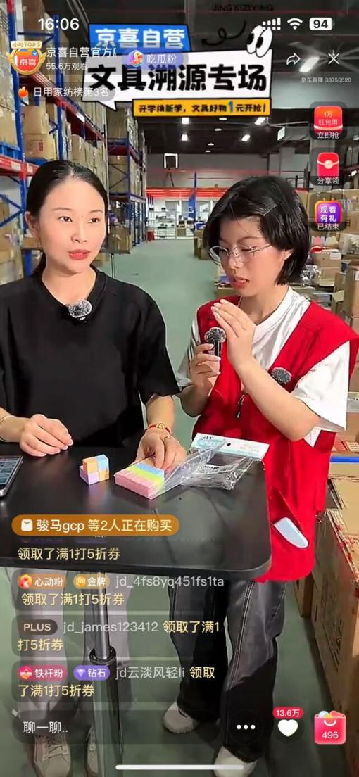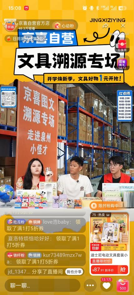 同时,京喜避免将直播变成“工厂巡检”,而是融入绘画才艺展示、IP动漫问答、包书皮比赛等趣味互动,让家长和孩子在了解品质的同时收获乐趣;同步推出的总裁砍价、1元秒杀、整点红包雨等福利,持续点燃观众参与热情。
