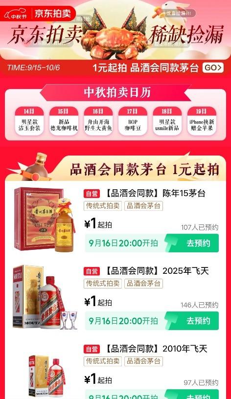 值得一提的是,9月16日,京东集团在北京国际饭店举办"京东品酒会",重启时隔18年的网友见面会。当晚,京东拍卖频道将开拍品酒会同款名酒,陈年茅台好酒仅需1元起拍,为追求高品质饮酒体验的用户提供更多选择。