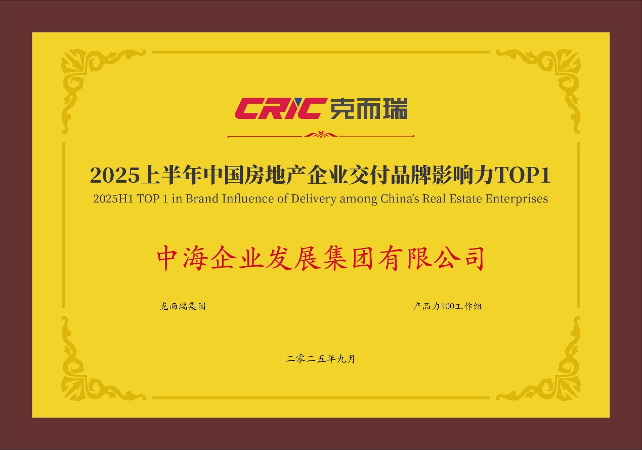 9月17日,由中国房地产业协会指导,上海易居房地产研究院、克而瑞集团主办,中房研协、克而瑞研究中心、克而瑞物管、优采共同承办的“向新而行”“2025 房地产企业品牌价值测评成果发布会暨第十五届房地产品牌发展高峰论坛”在上海召开。中海企业发展集团有限公司凭借卓越的企业管治能力、稳健的财务优势和领先的品牌竞争力,荣膺“2025房地产开发企业品牌价TOP10”榜首,品牌价值858亿元。同时,大会上中海企业发展集团有限公司还荣获克而瑞发布的“2025上半年中国房地产企业交付品牌影响力TOP1”奖项。